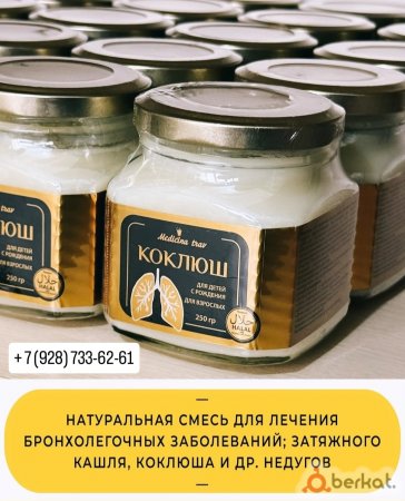 Натуральная смесь Коклюш для детей и взрослых! Состав: ✅Козий жир ✅Гусиный жир ✅Натуральный прополис ✅Живица сосны ✅Натуральный мед ✅Сок алоэ. ПРИМЕНЕНИЕ: Детям с 2 месяцев по одной капле /3 раза в день после еды. Детям с 3 месяцев по 3 капли /3 раза в день. Детям с 6 месяцев по 5 капель /3 раза в день. После еды! Детям с года по пол чайной ложке /3 раза в день, Взрослые по чайной ложке /3 раза в день до еды в течении месяца, Запить отваром шиповника, Курс 1 месяц перерыв /2 недели и так в год 2, 3 курса лечения . ПРОТИВОПОКАЗАНИЯ: - Цирроз печени - Аллергия на мёд. Объем: 250 гр. Цена : 1800₽